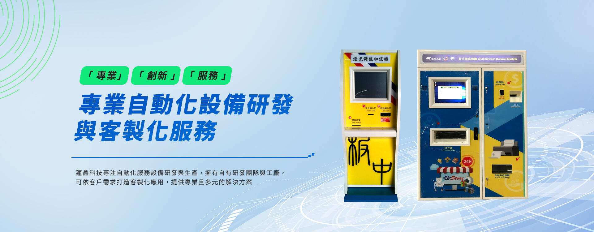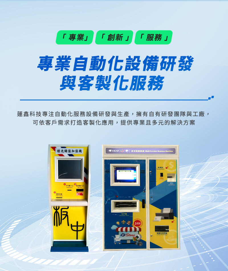 蓮鑫科技致力於自動化服務設備的研發及生產上已有多年的時間,我們有自己的軟硬體研發團隊及工廠,可以依據客戶的需求來開發各式新型態的應用,包含各項模組、功能以及外型顏色等,竭誠的為您服務。